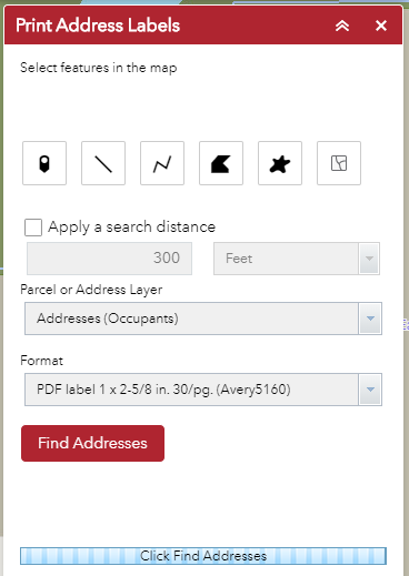 1. Select the type of label either Addresses (Occupants) or the Primary Tax Payer name and address. Addresses uses address point data, and Primary Tax Payer uses parcel polygon data.