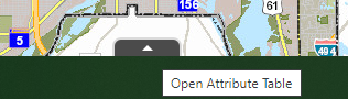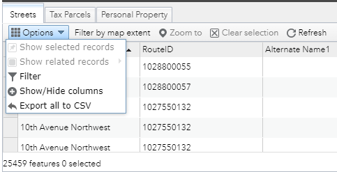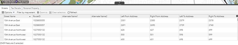 The arrow-up tab at the bottom of the map will open the attribute table for Streets, Parcels, and Personal Property. Each layer is a separate tab. The total number of records (and records selected) are at the bottom-left.