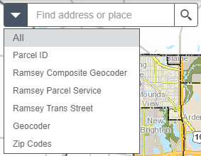 To find a particular address or parcel, type into the Search box, results should begin appearing for each type of search engine. You may also click the down-arrow and select a particular search engine. The map will pan and zoom to the location selected and a large red dot will appear at the address.