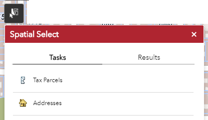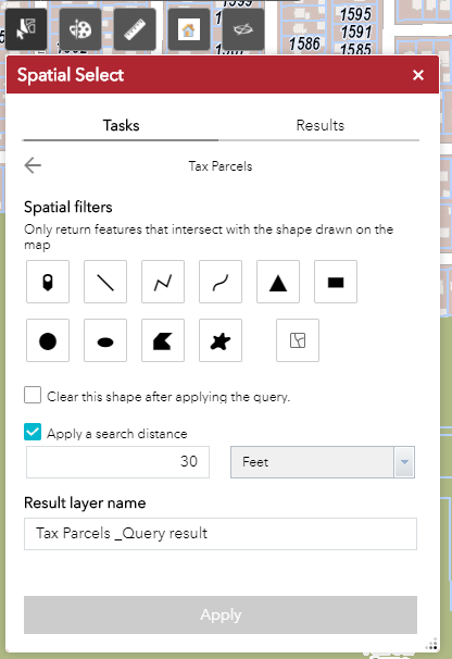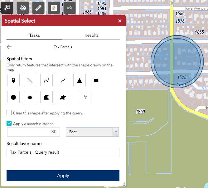 Select a tool to select features on the map. A buffer may also be applied (uncheck the Apply