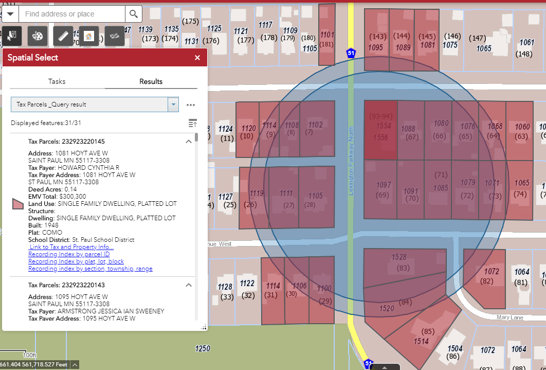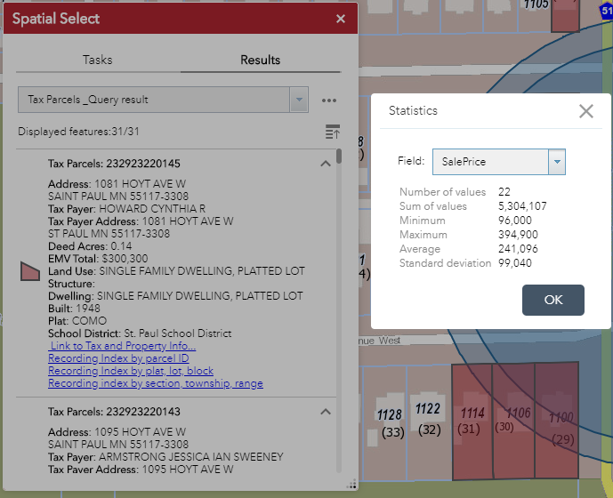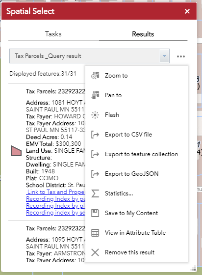 The map will zoom and center on the features selected, and the Results tab will display some of the key attributes of the features.