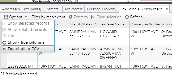 · Use the Export to CSV file on this tab and not the one on the attribute table. The Tax Parcels_Query result is a virtual table so the Export all to CSV will not work from the attribute table tab.