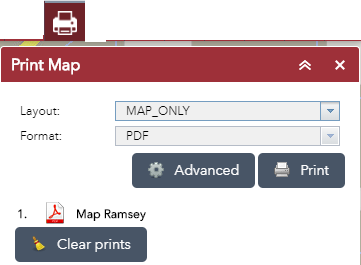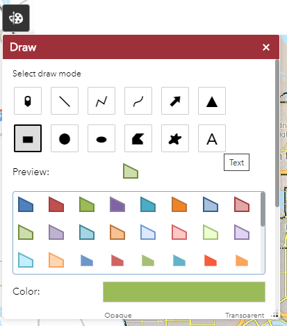 Graphics added to the map will automatically be added to the layer list, so they may be toggled on-and-off, and the transparency may be adjusted. These graphics are temporary, and the layers will disappear when the Clear button is clicked. The graphics map also be exported using the Select tool.
