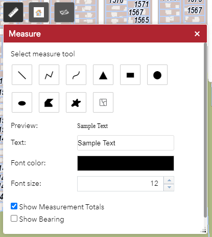 Select a tool/draw mode, then draw on the map. Press CTRL to enable snapping. Use the scroll bar on the right of the popup window to view additional tools and setting. The popup may be repositioned by dragging the title bar, and the window may be resized from the lower-right corner. Press Clear to remove all graphics.