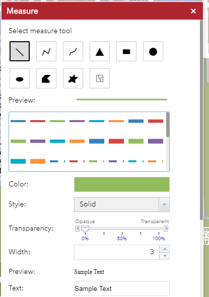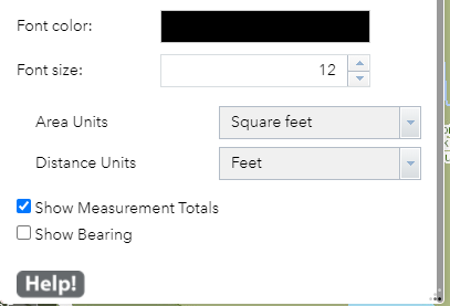 Color and transparency of the line, polygon fill, boundary may be adjusted, as well as the text color and size. Distance and area units may also be configured.
