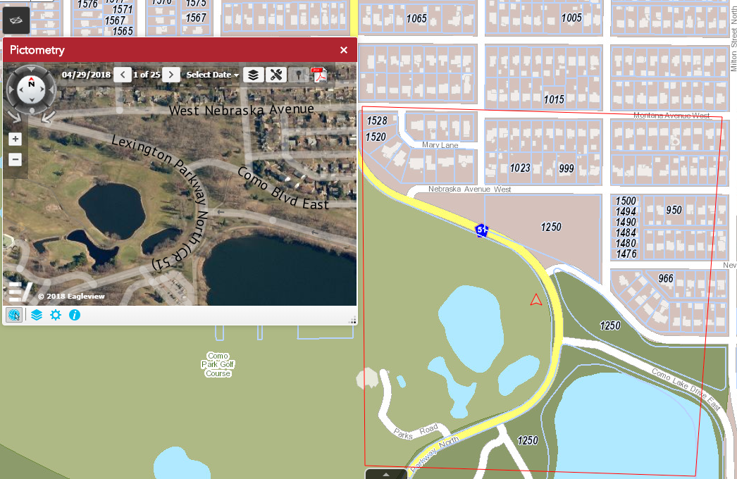 Pictometry is the provider of aerial oblique imagery for Ramsey County. After opening the Pictometry window, click on the map using the Pictometry tool.