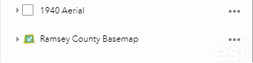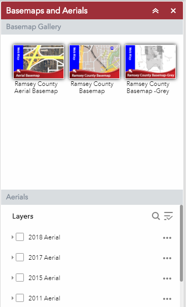 The Basemap Gallery contains only three options because other public basemaps are not compatible with the Ramsey County projection. An Aerial may also be placed on top of the basemap. The transparency of the basemap and the aerial may be adjusted by clicking on the 3 dots (…) and selecting Transparency. The date of the Aerial Basemap is the same as the date of the most recent Aerial (raster) layer.