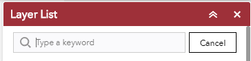 To find a particular layer click on the magnifier in the top-right of the Layer List and enter a keyword. This will limit the Layer List results. Click Cancel to view all layers.