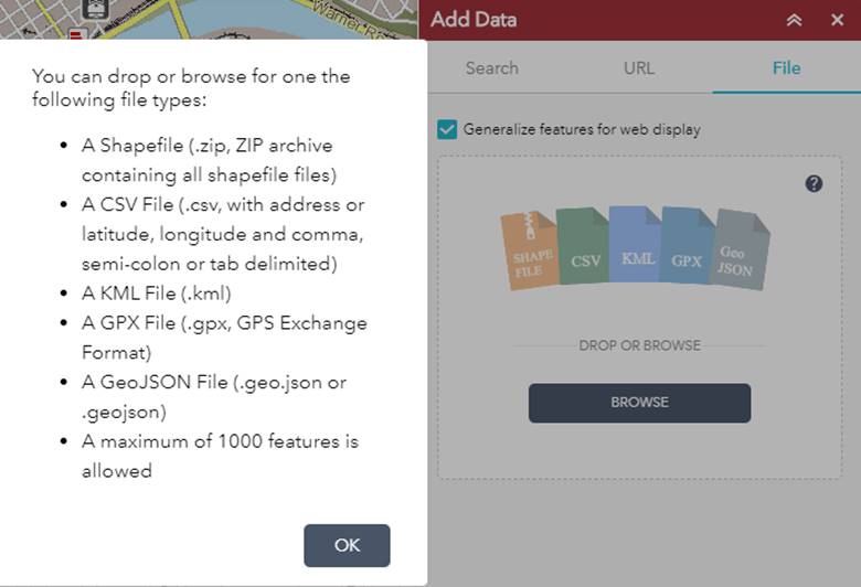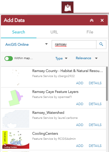 Data layers may be added from ArcGIS Online, files, or web service. Logging into AGOL is not necessary to view publicly available services. To remove a layer, also use the Add Data dialog; once a layer is added, the ADD will change to REMOVE.