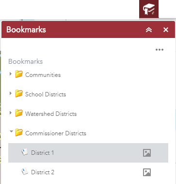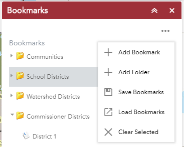 Predefined bookmarks have been added for common areas. Click on the arrow to expand each list. Custom bookmarks may be added, saved, and imported.